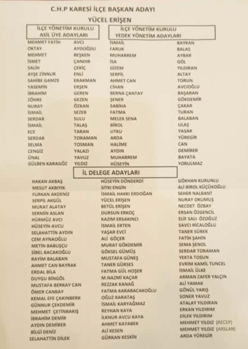 CHP'de İlçe Kongreleri sürüyor. Karesi AVM'deki Karesi İlçe Kongresi'nde birlik, beraberlik ve heyecan vardı. Yücel Erişen ve Hasan Hüseyin Yıldız'ın Başkanlık için yarıştığı Kongrede oylama saat 17:00'ye kadar sürecek. Salonun ibresi Yücel Erişen'i gösteriyor. İŞTE ERİŞEN’İN LİSTESİ Yorumlar